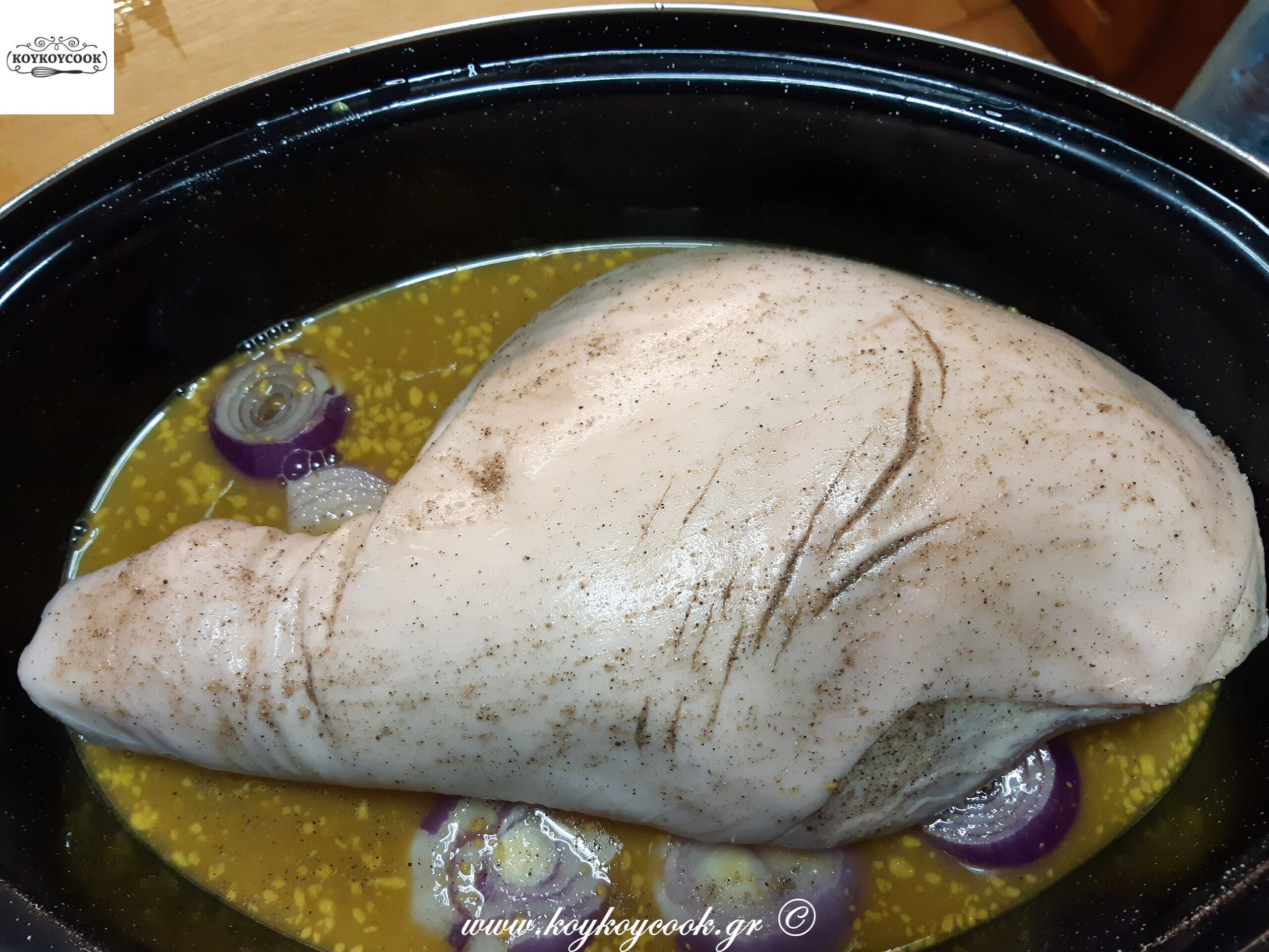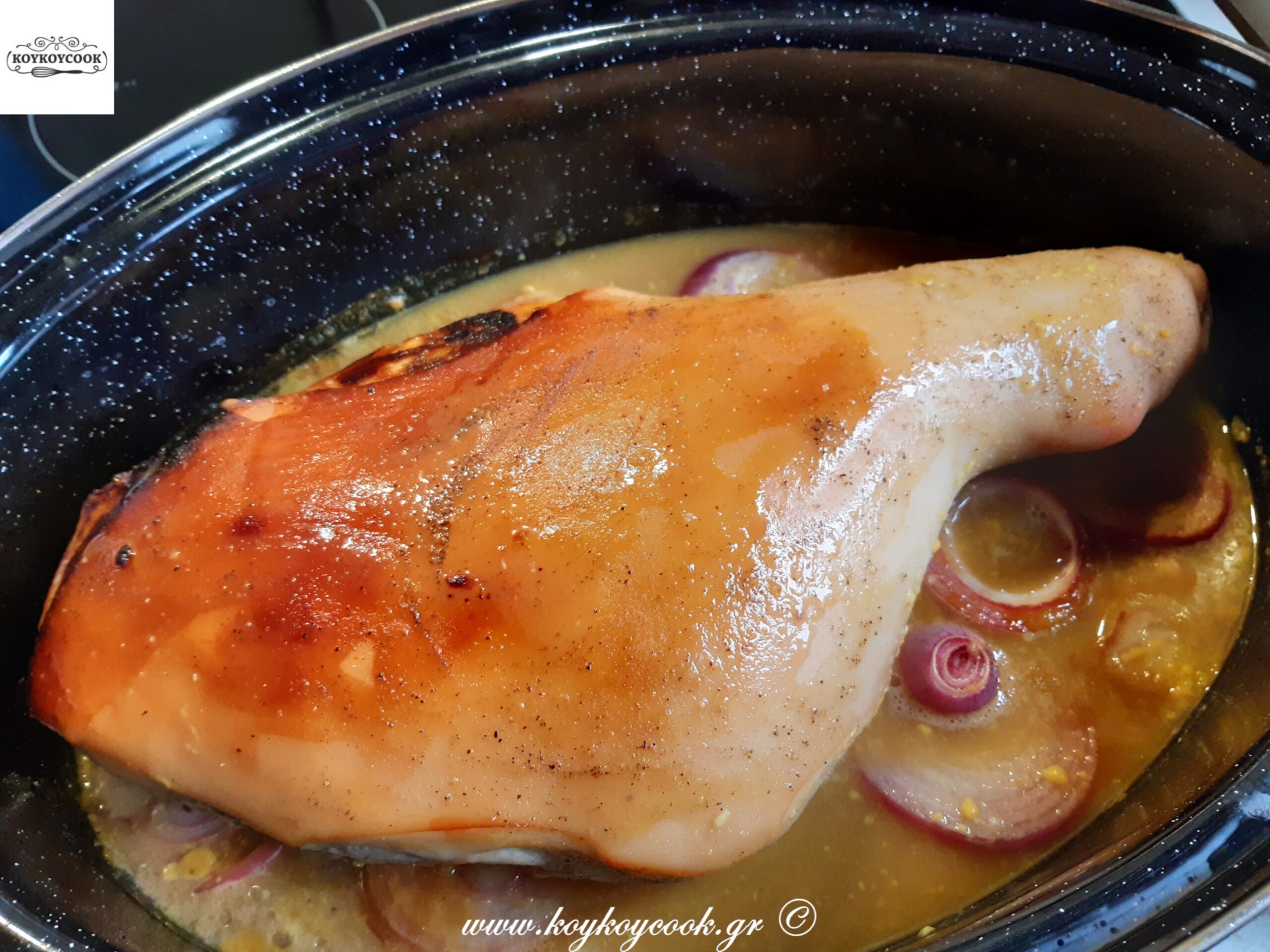 Βάλτε το μπούτι σας πάνω στα κρεμμύδια και ρίξτε την σάλτσα γύρω γύρω από το μπούτι..