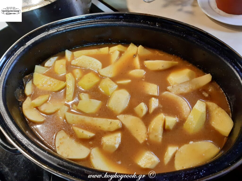 Αφαιρέστε το μπούτι οταν ψηθεί και ρίξτε μέσα στην γάστρα τις πατάτες σας .